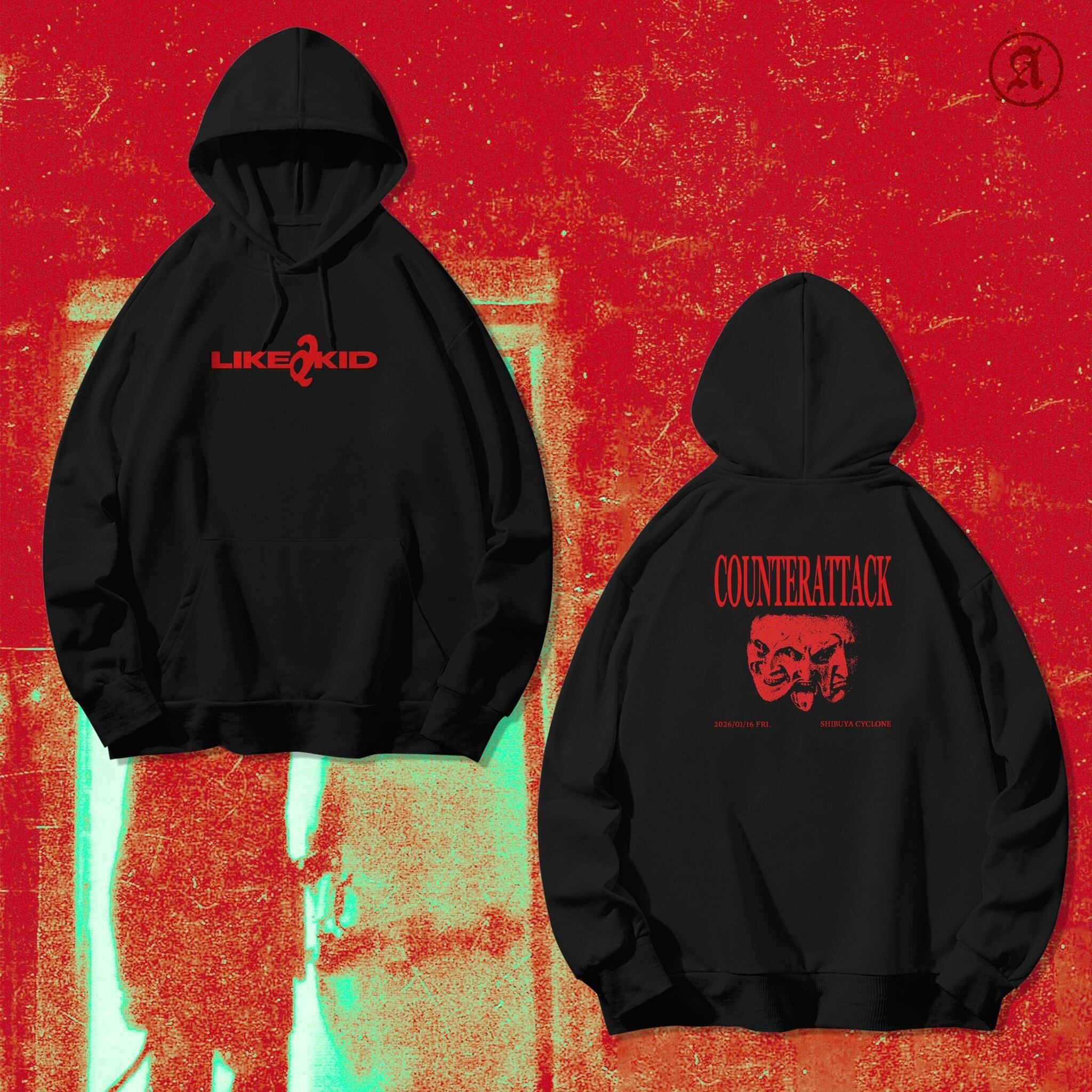 【COUNTERATTACK Hoodie】 バンドの世界観を落とし込んだ、期間限定の受注アイテム。 10.0ozのしっかりとした生地感の United Athle T/C プルオーバーパーカーを採用し、 普段使いからライブまで幅広く活躍する一枚に仕上げています。 ■ ボディ / 仕様 Body:United Athle 10.0 oz T/C プルオーバーパーカー Color:Black Size:S / M / L / XL / 2XL / 3XL ※2XLは +¥200 ※3XLは +¥300 ■ 受注期間 2024.11.22 ~ 2024.12.16 受注生産のみの限定販売となります。 ■ 発送について 受注期間終了後、製作に入ります。 お届けは 12月下旬〜1月上旬頃 を予定しております。 ※製作状況により前後する場合があります。